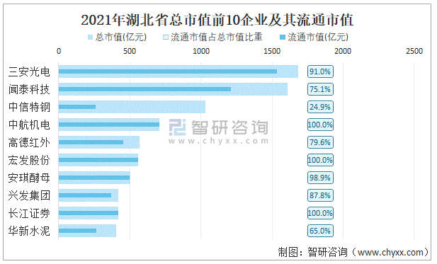 據(jù)同花順統(tǒng)計數(shù)據(jù)可知:截止至2021年12月31日,湖北省總市值最高的企業(yè)是三安光電,主要從事光學光電子行業(yè),總市值為1682.44億元,其流通市值占總市值比重為91.05%;總市值排名前10的企業(yè)市值共計7902.64億元,占全省總市值的42.81%。