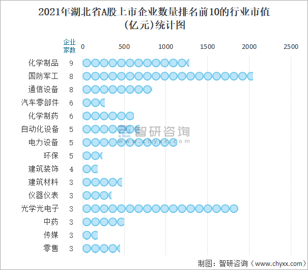 2021年湖北省A股上市企業(yè)數(shù)量排名前10的行業(yè)市值(億元)統(tǒng)計圖