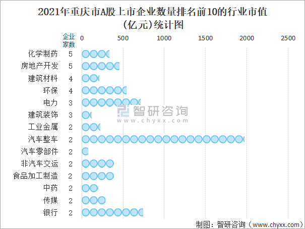 2021年重慶市A股上市企業(yè)數(shù)量排名前10的行業(yè)市值(億元)統(tǒng)計圖