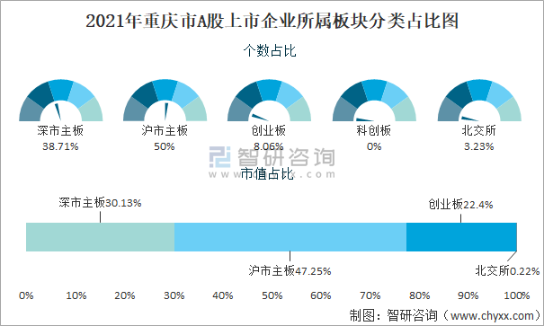 據(jù)同花順統(tǒng)計數(shù)據(jù)可知:截止至2021年12月31日,重慶市A股上市企業(yè)中在滬市主板上市的企業(yè)數(shù)量最多且總市值最高,共計31家企業(yè)在滬市主板上市,占全省A股上市企業(yè)數(shù)量比重為50%,其總市值共計5557.4億元,占全省A股上市企業(yè)總市值比重為47.25%,重慶市暫無企業(yè)在科創(chuàng)板上市。