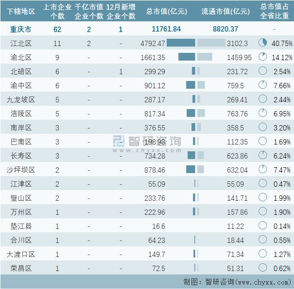 據(jù)同花順統(tǒng)計數(shù)據(jù)可知:截止至2021年12月31日,重慶市的A股上市企業(yè)共計62家,上市企業(yè)數(shù)量排名全國第17,總市值共計11761.84億元,其中長江材料1家企業(yè)為12月新在A股上市的企業(yè);除永川市、石柱縣、開縣、云陽縣4個地級行政區(qū)以外,重慶市其他17個地級行政區(qū)均有企業(yè)在A股上市,其中江北區(qū)上市企業(yè)數(shù)量最多,為11家;重慶市有2家A股上市企業(yè)市值超千億元,數(shù)量排名全國第19,其總部均在江北區(qū);江北區(qū)A股上市企業(yè)總市值總流通市值均為最高。
