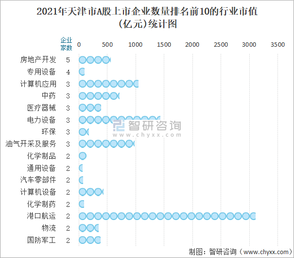 2021年天津市A股上市企業數量排名前10的行業市值(億元)統計圖