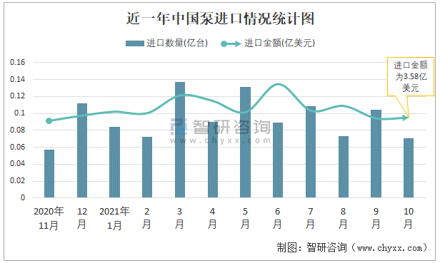 根據中國海關數據顯示:2021年10月中國泵進口數量為0.07億臺,同比下降50.1%,進口金額為3.58億美元,同比增長2.9%,2021年10月中國泵出口數量為3.16億臺,同比下降57.1%,出口金額為6.73億美元,同比增長14.4%;2021年1-10月中國泵進口數量為0.96億臺,進口金額為40.47億美元,出口數量為38.76億臺,出口金額為66.39億美元。