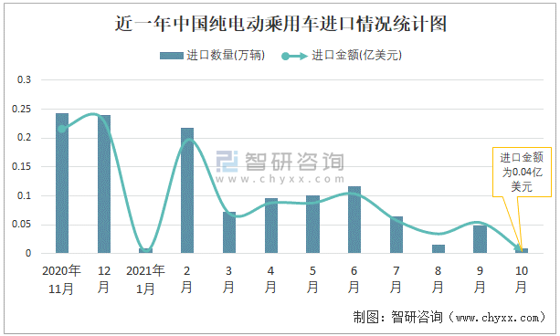 近一年中國(guó)純電動(dòng)乘用車進(jìn)口情況統(tǒng)計(jì)圖