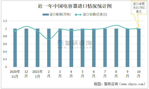 根據中國海關數據顯示:2021年10月中國電容器進口數量為1萬噸,同比增長5.4%,進口金額為11.73億美元,同比增長20.2%,2021年1-10月中國電容器進口數量為7萬噸,進口金額為112.8億美元。