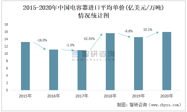 2015-2020年中國電容器進口平均單價(億美元/萬噸)情況統計圖