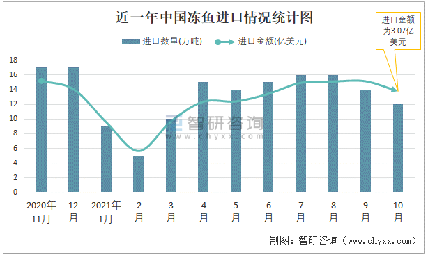 根據中國海關數據顯示:2021年10月中國凍魚進口數量為12萬噸,同比下降10.9%,進口金額為3.07億美元,同比增長18.6%,2021年1-10月中國凍魚進口數量為127萬噸,進口金額為27.13億美元。