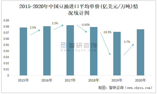 根據中國海關數據顯示:2015-2020年中國豆油進口數量與進口金額均在2018年跌至最低值,此后逐年遞增;2015-2020年中國豆油進口平均單價2020年增長速度最快,而2019年中國豆油進口平均單價下降速度最快,下滑了10.3%。