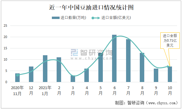 根據中國海關數據顯示:2021年10月中國豆油進口數量為7萬噸,同比下降5.4%,進口金額為0.71億美元,同比增長49.9%,2021年1-10月中國豆油進口數量為111萬噸,進口金額為10.52億美元。