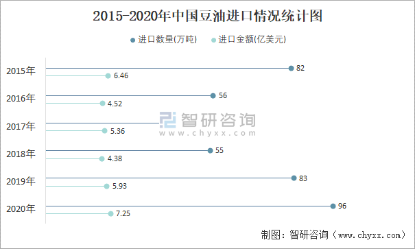 2015-2020年中國豆油進口情況統計圖