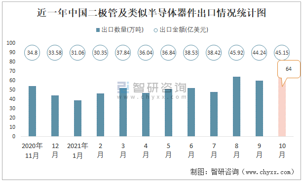 根據中國海關數據顯示:2021年10月中國二極管及類似半導體器件進口數量為1萬噸,同比增長72.7%,進口金額為23.94億美元,同比增長21.7%,2021年10月中國二極管及類似半導體器件出口數量為64萬噸,同比增長27.8%,出口金額為45.15億美元,同比增長42.4%;2021年1-10月中國二極管及類似半導體器件進口數量為9萬噸,進口金額為243.37億美元,出口數量為523萬噸,出口金額為384.29億美元。