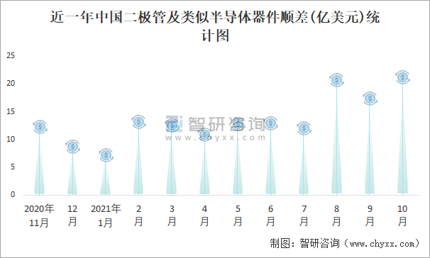 根據中國海關數據顯示:近一年中國二極管及類似半導體器件進口金額總體小于出口金額,進出口貿易全部為順差,10月順差規模有所擴大。