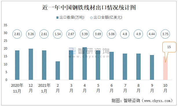 近一年中國鋼鐵線材出口情況統計圖