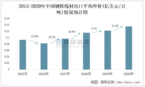 根據中國海關數據顯示:2015-2020年中國鋼鐵線材出口數量總體呈下降趨勢,出口金額在2016年跌至最低值,此后逐年遞增;2015-2020年中國鋼鐵線材出口平均單價2018年增長速度最快,而2016年中國鋼鐵線材出口平均單價下降速度最快,下滑了11.8%,跌至最低值。