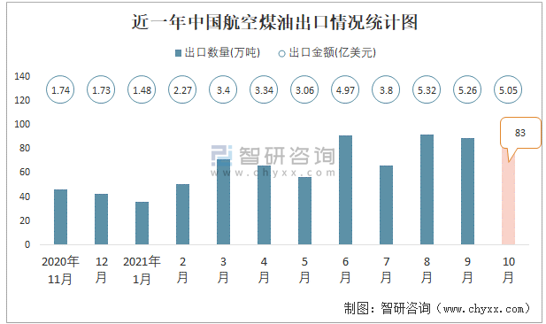根據中國海關數據顯示:2021年10月中國航空煤油進口數量為13萬噸,同比增長541.4%,進口金額為0.89億美元,同比增長1356.9%,2021年10月中國航空煤油出口數量為83萬噸,同比增長90%,出口金額為5.05億美元,同比增長239.5%;2021年1-10月中國航空煤油進口數量為117萬噸,進口金額為6.63億美元,出口數量為702萬噸,出口金額為38.82億美元。