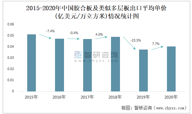 2015-2020年中國膠合板及類似多層板出口平均單價(億美元/萬立方米)情況統計圖