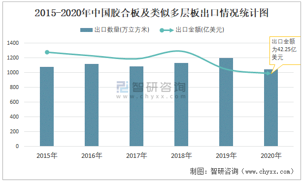 2015-2020年中國膠合板及類似多層板出口情況統計圖