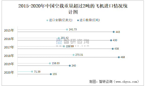 2015-2020年中國空載重量超過2噸的飛機進口情況統計圖