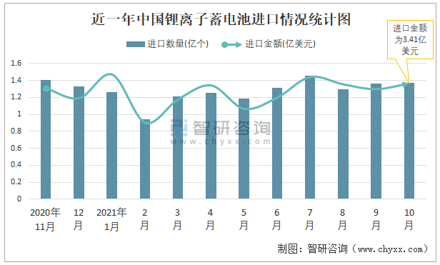 根據(jù)中國海關(guān)數(shù)據(jù)顯示:2021年10月中國鋰離子蓄電池進(jìn)口數(shù)量為1.37億個(gè),同比增長6.5%,進(jìn)口金額為3.41億美元,同比增長13.7%,2021年10月中國鋰離子蓄電池出口數(shù)量為3.46億個(gè),同比增長52.9%,出口金額為27.2億美元,同比增長68.6%;2021年1-10月中國鋰離子蓄電池進(jìn)口數(shù)量為12.65億個(gè),進(jìn)口金額為31.54億美元,出口數(shù)量為27.05億個(gè),出口金額為217.66億美元。