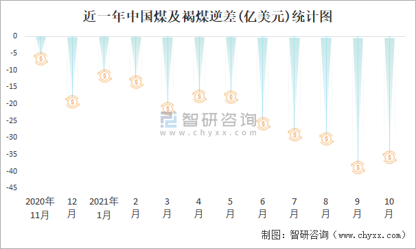 近一年中國煤及褐煤逆差(億美元)統(tǒng)計(jì)圖