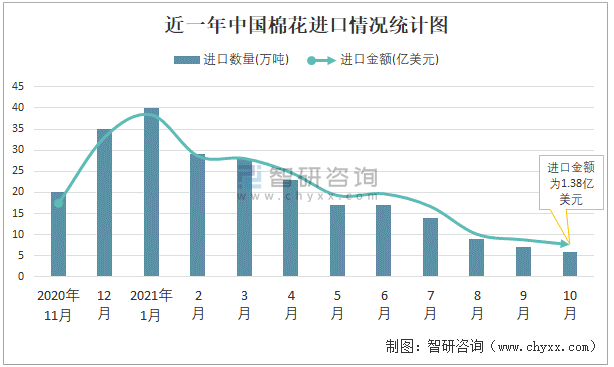 根據(jù)中國海關(guān)數(shù)據(jù)顯示:2021年10月中國棉花進口數(shù)量為6萬噸,同比下降69.5%,進口金額為1.38億美元,同比下降57%,2021年1-10月中國棉花進口數(shù)量為191萬噸,進口金額為35.92億美元。