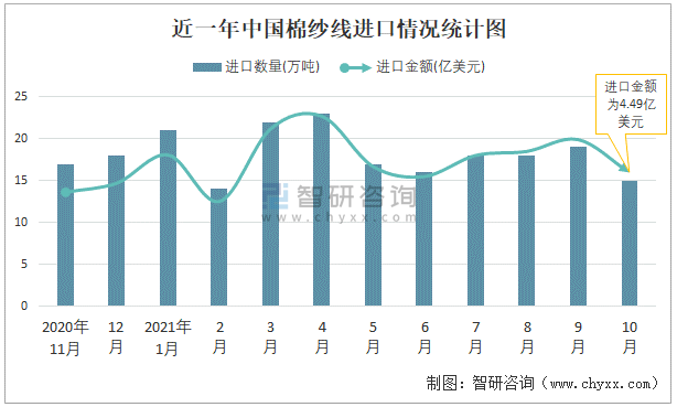 根據(jù)中國海關(guān)數(shù)據(jù)顯示:2021年10月中國棉紗線進(jìn)口數(shù)量為15萬噸,同比下降12.5%,進(jìn)口金額為4.49億美元,同比增長24.9%,2021年1-10月中國棉紗線進(jìn)口數(shù)量為183萬噸,進(jìn)口金額為50.31億美元。