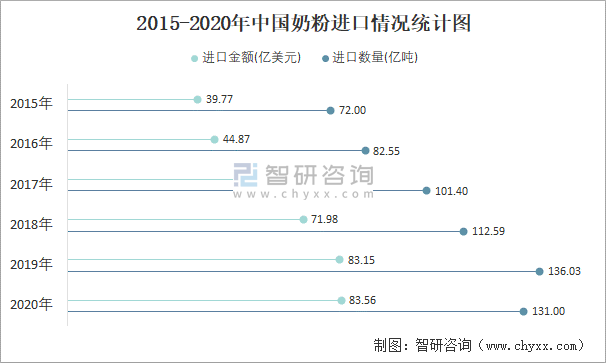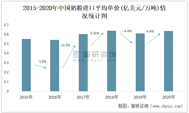 2015-2020年中國奶粉進口情況統計圖