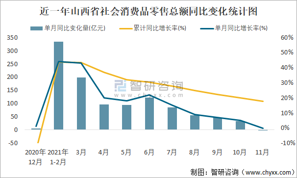 根據國家統計局數據可知:從已公布的單月數據來看,僅11月的山西省社會消費品零售總額單月同比減少,單月同比增加的月份中,2021年3月的單月同比增加量最大,社會消費品零售總額較2020年同期增加198.1億元;近一年僅2020年12月的山西省社會消費品零售總額累計同比下降,單月同比增長率和累計同比增長率均在2021年3月達到最大。