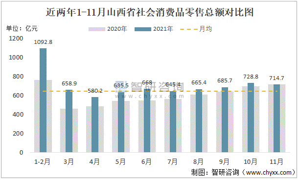 根據國家統計局數據可知:2021年1-11月山西省累計社會消費品零售總額為7075.4億元,其中11月山西省社會消費品零售總額為714.7億元,單月社會消費品零售總額環比減少1.93%;1-11月山西省月均社會消費品零售總額為643.2億元,低于11月山西省社會消費品零售總額,高于4月、5月的山西省社會消費品零售總額。