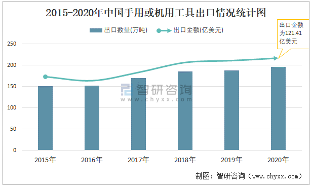 根據中國海關數據顯示:2015-2020年中國手用或機用工具出口數量逐年遞增,出口金額2016年跌至最低值,此后逐年遞增;2015-2020年中國手用或機用工具出口平均單價2018年增長速度最快,而2016年中國手用或機用工具出口平均單價下降速度最快,下滑了5.9%。