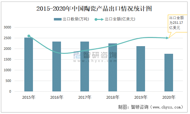 2015-2020年中國陶瓷產(chǎn)品出口情況統(tǒng)計圖