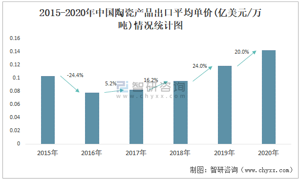 2015-2020年中國陶瓷產(chǎn)品出口平均單價(億美元/萬噸)情況統(tǒng)計圖