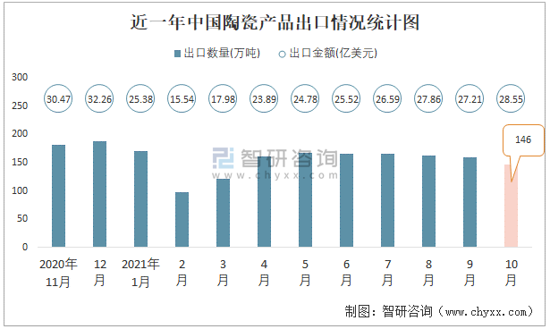 根據(jù)中國海關數(shù)據(jù)顯示:2021年10月中國陶瓷產(chǎn)品出口數(shù)量為146萬噸,同比下降4.9%,出口金額為28.55億美元,同比增長19.8%;2021年1-10月中國陶瓷產(chǎn)品出口數(shù)量為1517萬噸,出口金額為243.26億美元。