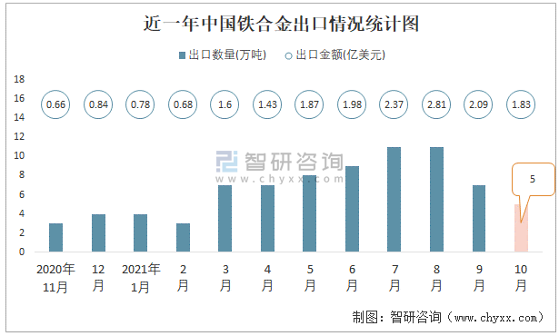 根據(jù)中國(guó)海關(guān)數(shù)據(jù)顯示:2021年10月中國(guó)鐵合金出口數(shù)量為5萬(wàn)噸,同比增長(zhǎng)53.3%,出口金額為1.83億美元,同比增長(zhǎng)205.7%;2021年1-10月中國(guó)鐵合金出口數(shù)量為73萬(wàn)噸,出口金額為17.44億美元。