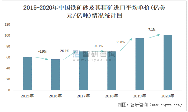 2015-2020年中國鐵礦砂及其精礦進口平均單價(億美元/億噸)情況統計圖