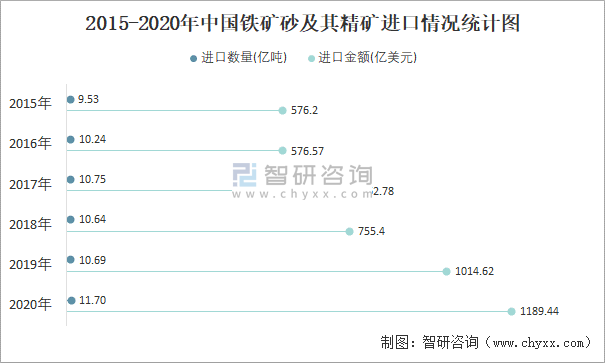 2015-2020年中國鐵礦砂及其精礦進口情況統計圖