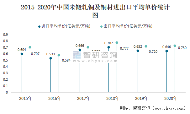 根據中國海關數據顯示:2015-2020中國未鍛軋銅及銅材進口數量總體高于出口數量,進口數量在2017年跌至最低值,此后有所回升,出口數量在2016年達到最大值,此后總體呈下降趨勢,2015-2020中國未鍛軋銅及銅材進出口平均單價存在明顯幅度的波動。