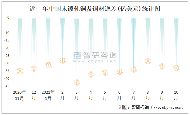 近一年中國未鍛軋銅及銅材逆差(億美元)統計圖