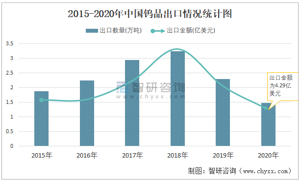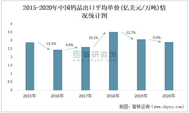 2015-2020年中國鎢品出口平均單價(億美元/萬噸)情況統計圖