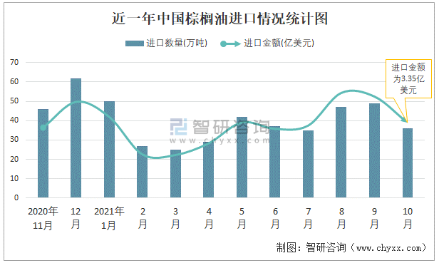 根據中國海關數據顯示:2021年10月中國棕櫚油進口數量為36萬噸,同比下降31.1%,進口金額為3.35億美元,同比增長5.6%,2021年1-10月中國棕櫚油進口數量為377萬噸,進口金額為32.06億美元。