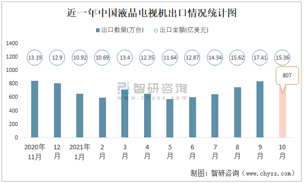 近一年中國液晶電視機出口情況統(tǒng)計圖
