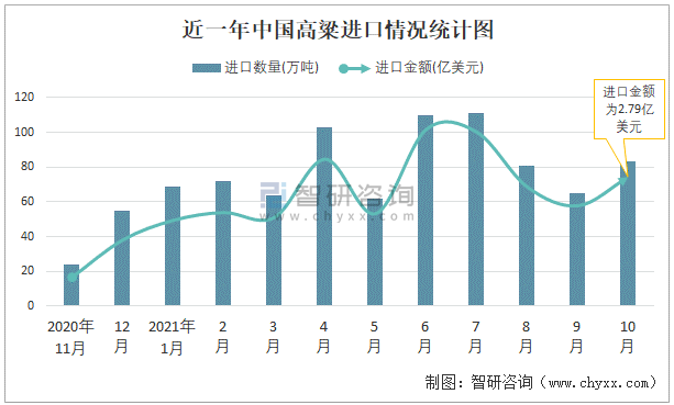 根據(jù)中國海關(guān)數(shù)據(jù)顯示:2021年10月中國高粱進(jìn)口數(shù)量為83萬噸,同比增長(zhǎng)57.2%,進(jìn)口金額為2.79億美元,同比增長(zhǎng)119.4%,2021年1-10月中國高粱進(jìn)口數(shù)量為818萬噸,進(jìn)口金額為26.07億美元。