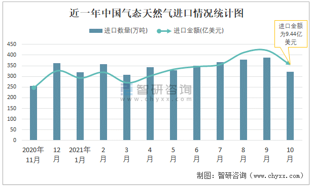 近一年中國氣態天然氣進口情況統計圖
