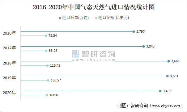 2016-2020年中國氣態天然氣進口情況統計圖