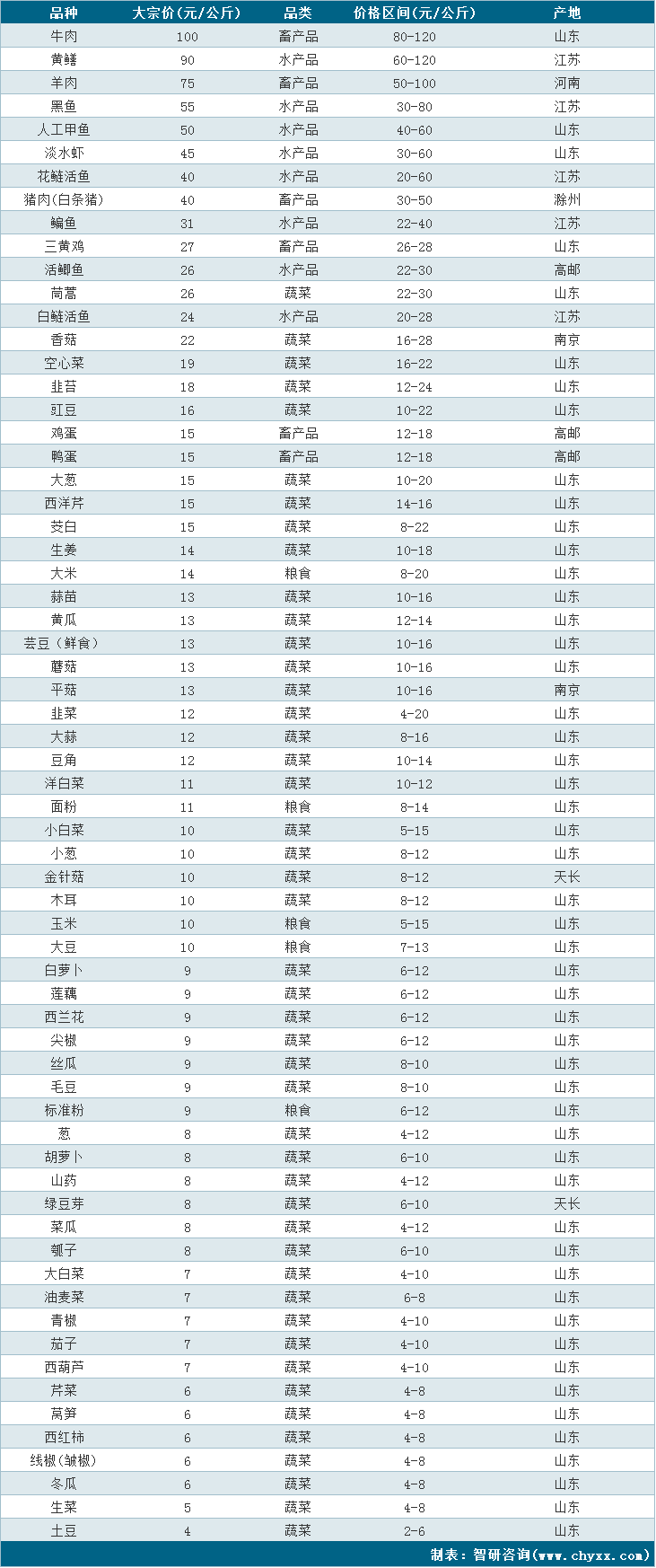 根據農業農村部數據統計可知:2022年1月13日14:00天長市永福農產品發布了65個農產品品種價格,其中包含糧食5個,蔬菜46個,畜產品6個,水產品8個;牛肉大宗價最高,當日價格區間在80-120元/公斤;水產品以黃鱔大宗價最高,90元/公斤的價格高于其他水產品;蔬菜以茼蒿、香菇、空心菜這3個品類大宗價最高。