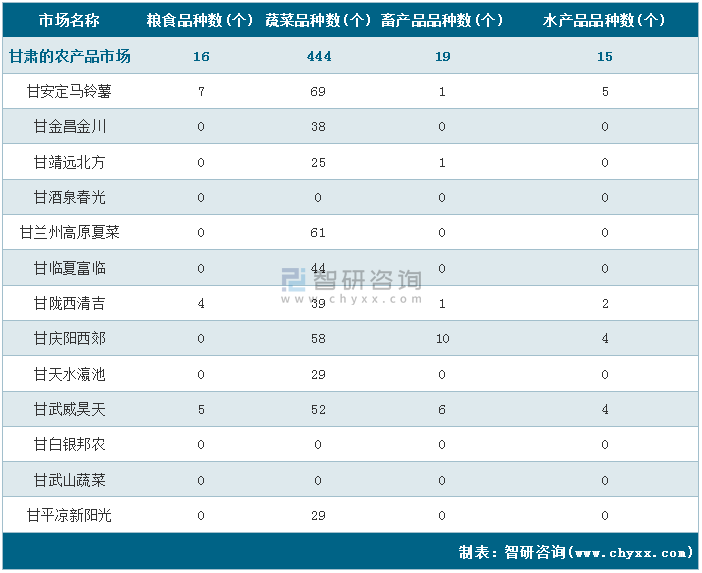 根據農業農村部數據統計可知:截至2022年1月13日14:00,甘肅13個市場發布了494條農產品品類價格數據,其中蔬菜品種最多,有444條,其次是畜產品品種,13個市場中,以甘安定馬鈴薯發布農產品品種價格數據最多。