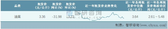 根據農村農業部數據統計可知:2022年第2周全國油菜平均批發價為3.36元/公斤,同比下跌31.98%,環比下跌3.72%,近一年全國油菜平均批發價最高達到5.48元/公斤,批發價最低也要2.61元/公斤。