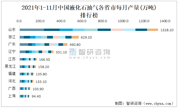 2021年1-11月中國液化石油氣各省市每月產量排行榜