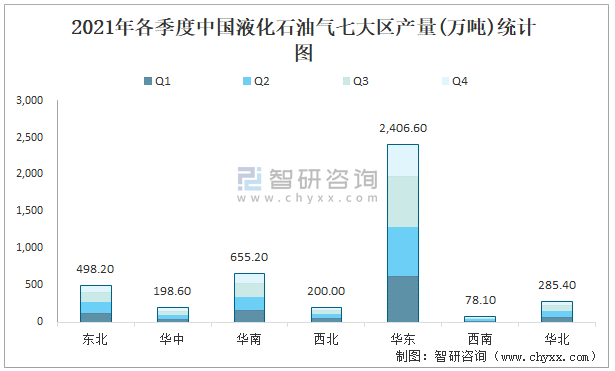 2021年各季度中國液化石油氣七大區產量統計圖
