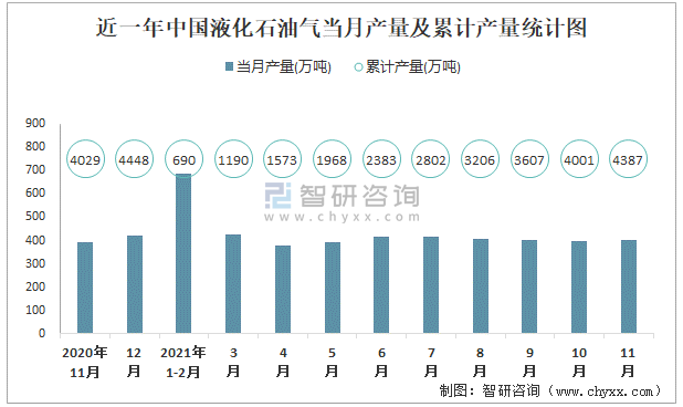 近一年中國液化石油氣當月產量及累計產量統計圖